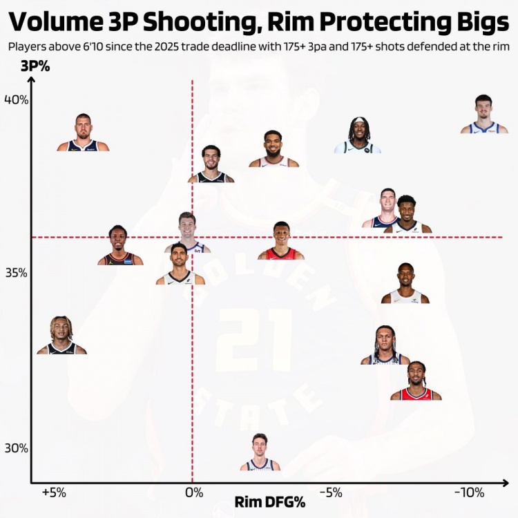 統計范圍:自2025年交易截止日以來,年交內線能攻身高超過6尺10寸(約208cm)且三分出手次數和籃下防守次數均至少175次的易日球員。